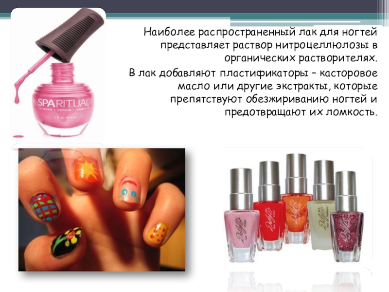 Слайд 11Наиболее распространенный лак для ногтей представляет раствор нитроцеллюлозы в органических растворителях.