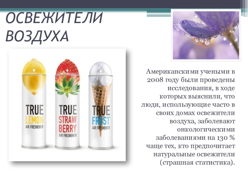 которых выяснили, что люди, использующие часто в своих домах освежители воздуха, заболевают онкологическими заболеваниями на 130 % чаще тех, кто предпочитает натуральные освежители