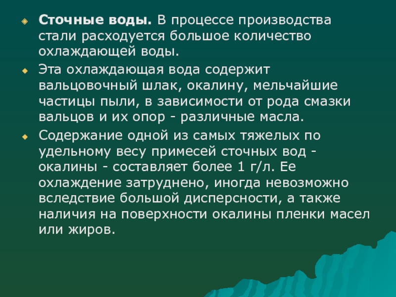 Содержание одной из самых тяжелых по удельному весу примесей сточных вод - окалины - составляет более 1 г/л. Ее охлаждение затруднено, иногда невозможно вследствие большой дисперсности, а также наличия на поверхности окалины пленки масел или жиров.