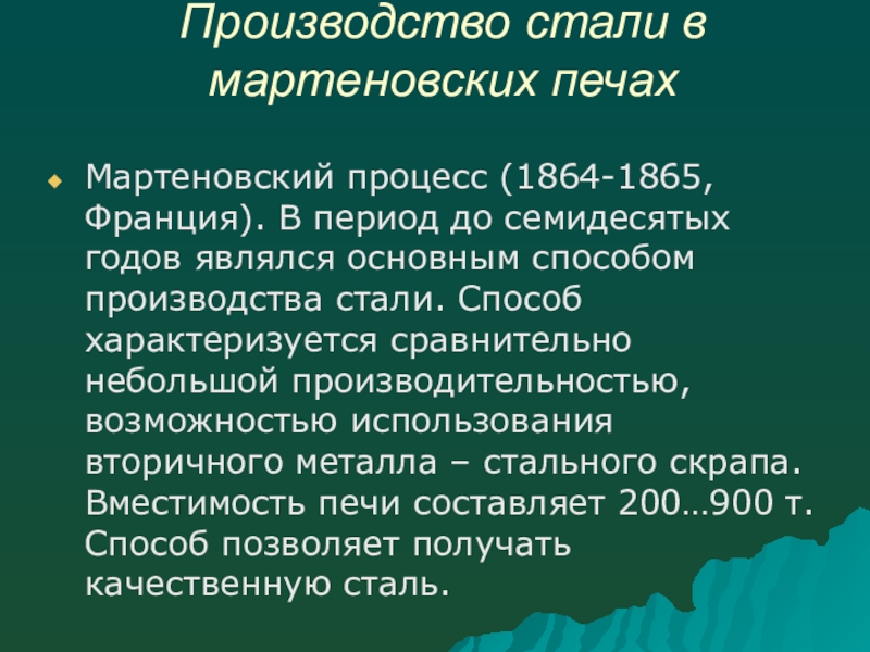 семидесятых годов являлся основным способом производства стали. Способ характеризуется сравнительно небольшой производительностью, возможностью использования вторичного металла – стального скрапа. Вместимость печи составляет 200…900 т. Способ позволяет получать качественную сталь.