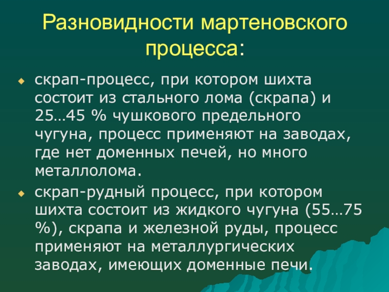 и 25…45 % чушкового предельного чугуна, процесс применяют на заводах, где нет доменных печей, но много металлолома.