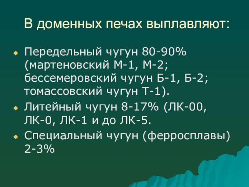 Передельный чугун 80-90% (мартеновский М-1, М-2; бессемеровский чугун