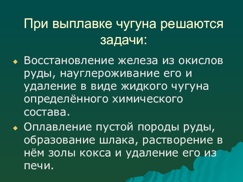 Оплавление пустой породы руды, образование шлака, растворение в нём золы кокса и удаление его из печи.