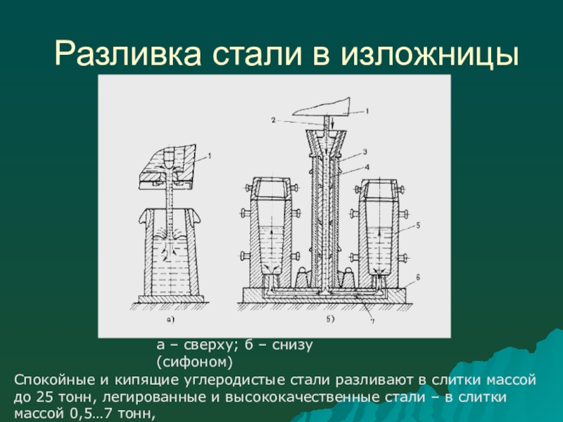 кипящие углеродистые стали разливают в слитки массой до 25 тонн, легированные и высококачественные стали – в слитки массой 0,5…7 тонн,