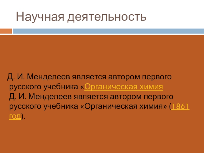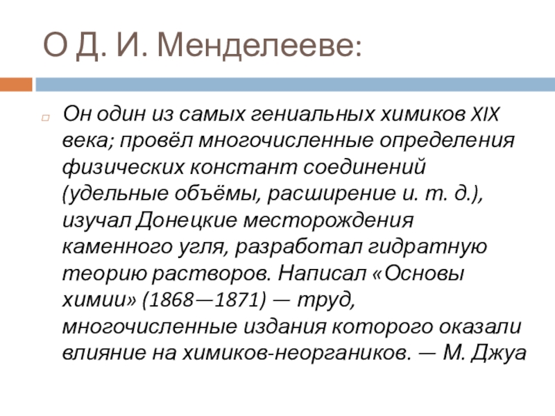 русский учёный-энциклопедист, общественный деятель. Химик, физикохимик— русский учёный-энциклопедист, общественный деятель. Химик, физикохимик, физик— русский учёный-энциклопедист, общественный деятель. Химик, физикохимик, физик, метролог— русский учёный-энциклопедист, общественный деятель. Химик, физикохимик, физик, метролог, экономист— русский учёный-энциклопедист, общественный деятель. Химик, физикохимик, физик, метролог, экономист, технолог— русский учёный-энциклопедист, общественный деятель. Химик, физикохимик, физик, метролог, экономист, технолог, геолог— русский учёный-энциклопедист, общественный деятель. Химик, физикохимик, физик, метролог, экономист, технолог, геолог, метеоролог— русский учёный-энциклопедист, общественный деятель. Химик, физикохимик, физик, метролог, экономист, технолог, геолог, метеоролог, педагог— русский учёный-энциклопедист, общественный деятель. Химик, физикохимик, физик, метролог, экономист, технолог, геолог, метеоролог, педагог, воздухоплаватель— русский учёный-энциклопедист, общественный деятель. Химик, физикохимик, физик, метролог, экономист, технолог, геолог, метеоролог, педагог, воздухоплаватель, приборостроитель— русский учёный-энциклопедист, общественный деятель. Химик, физикохимик, физик, метролог, экономист, технолог, геолог, метеоролог, педагог, воздухоплаватель, приборостроитель. Профессор— русский учёный-энциклопедист, общественный деятель. Химик, физикохимик, физик, метролог, экономист, технолог, геолог, метеоролог, педагог, воздухоплаватель, приборостроитель. Профессор Санкт-Петербургского университета— русский учёный-энциклопедист, общественный деятель. Химик, физикохимик, физик, метролог, экономист, технолог, геолог, метеоролог, педагог, воздухоплаватель, приборостроитель. Профессор Санкт-Петербургского университета; член-корреспондент— русский учёный-энциклопедист, общественный деятель. Химик, физикохимик, физик, метролог, экономист, технолог, геолог, метеоролог, педагог, воздухоплаватель, приборостроитель. Профессор Санкт-Петербургского университета; член-корреспондент по разряду «физический» Императорской Санкт-Петербургской Академии наук— русский учёный-энциклопедист, общественный деятель. Химик, физикохимик, физик, метролог, экономист, технолог, геолог, метеоролог, педагог, воздухоплаватель, приборостроитель. Профессор Санкт-Петербургского университета; член-корреспондент по разряду «физический» Императорской Санкт-Петербургской Академии наук. Среди наиболее известных открытий — периодический закон— русский учёный-энциклопедист, общественный деятель. Химик, физикохимик, физик, метролог, экономист, технолог, геолог, метеоролог, педагог, воздухоплаватель, приборостроитель. Профессор Санкт-Петербургского университета; член-корреспондент по разряду «физический» Императорской Санкт-Петербургской Академии наук. Среди наиболее известных открытий — периодический закон химических элементов— русский учёный-энциклопедист, общественный деятель. Химик, физикохимик, физик, метролог, экономист, технолог, геолог, метеоролог, педагог, воздухоплаватель, приборостроитель. Профессор Санкт-Петербургского университета; член-корреспондент по разряду «физический» Императорской Санкт-Петербургской Академии наук. Среди наиболее известных открытий — п