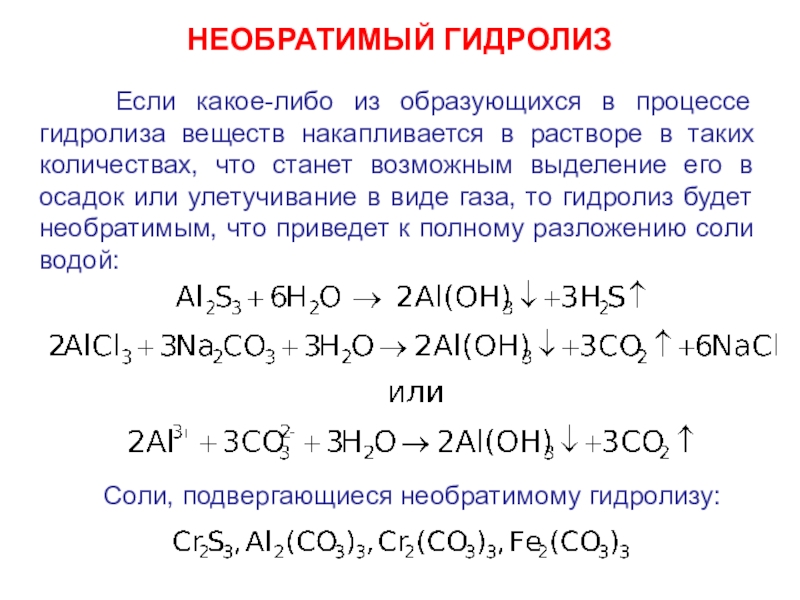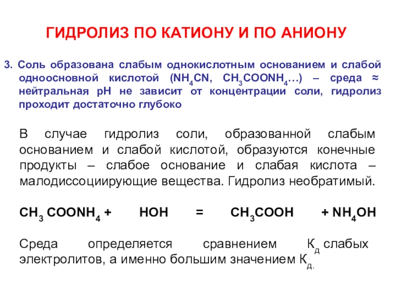 В случае гидролиз соли, образованной слабым основанием и слабой кислотой, образуются конечные продукты – слабое основание и слабая кислота – малодиссоциирующие вещества. Гидролиз необратимый.