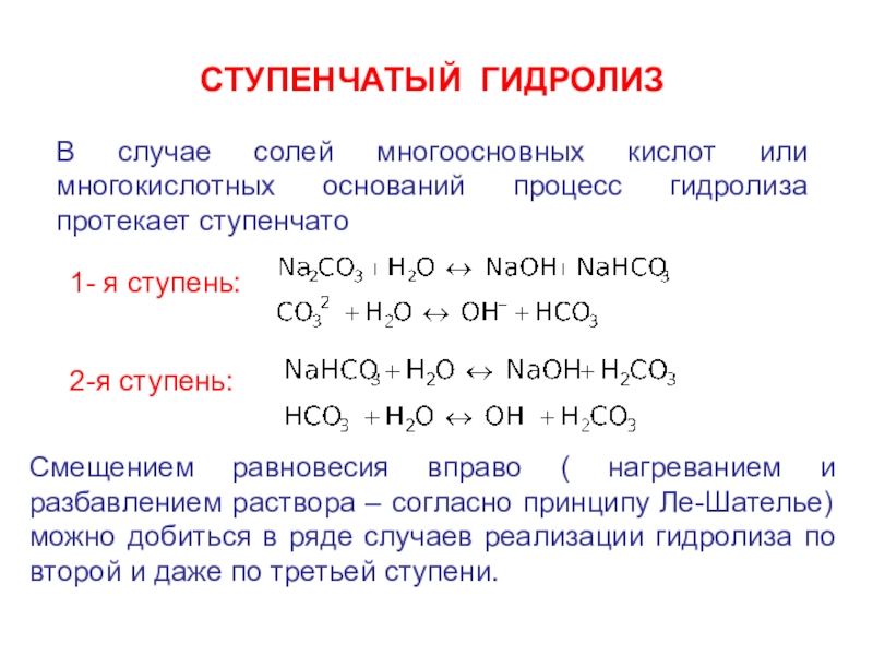 В случае солей многоосновных кислот или многокислотных оснований процесс гидролиза протекает ступенчато