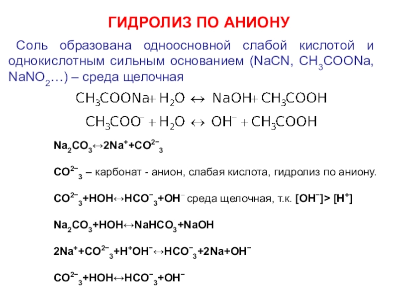 CO2−3 – карбонат - анион, слабая кислота, гидролиз по аниону.