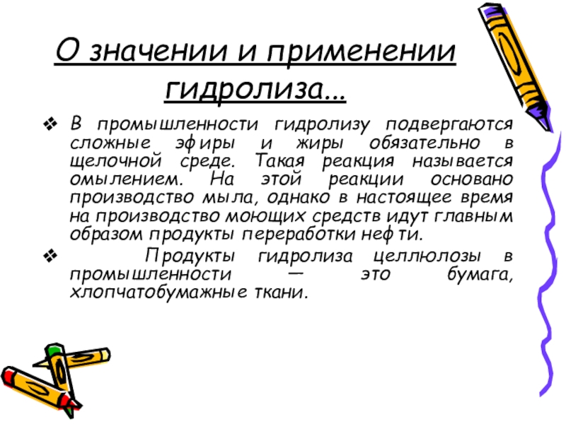 О значении и применении гидролиза...В промышленности гидролизу подвергаются сложные эфиры и жиры обязательно в щелочной среде. Такая