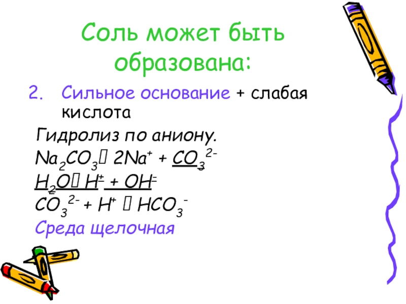 Соль может быть образована:Сильное основание + слабая кислотаГидролиз по аниону.Na2CO3? 2Na+ + CO32-H2O? H+ + OH-CO32- +