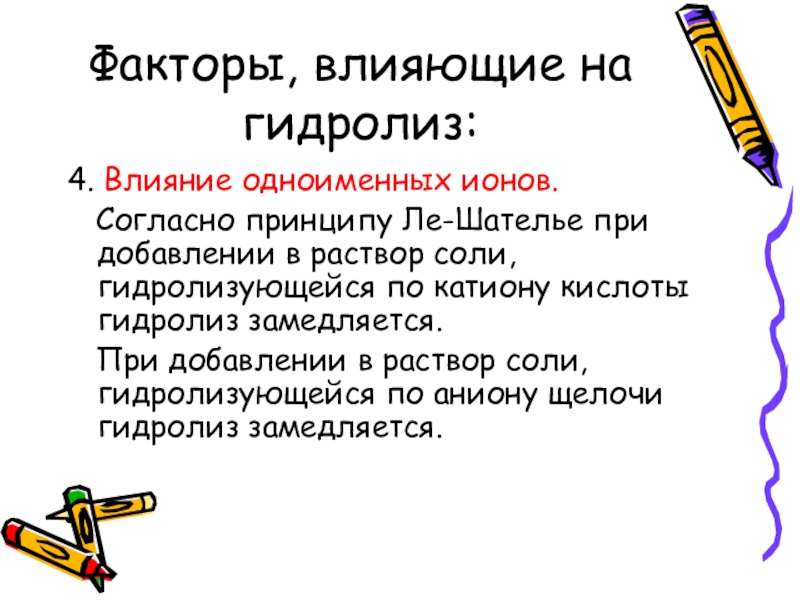 Факторы, влияющие на гидролиз:4. Влияние одноименных ионов.  Согласно принципу Ле-Шателье при добавлении в раствор соли, гидролизующейся
