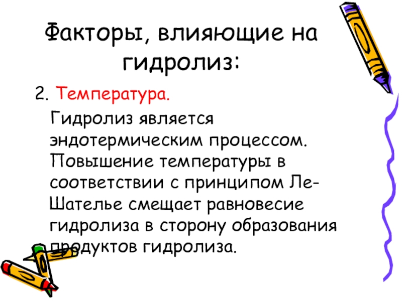 Факторы, влияющие на гидролиз:2. Температура.  Гидролиз является эндотермическим процессом. Повышение температуры в соответствии с принципом Ле-Шателье