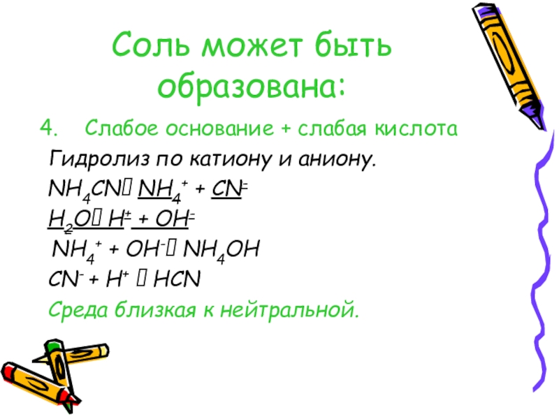 Соль может быть образована:Слабое основание + слабая кислотаГидролиз по катиону и аниону.NH4CN? NH4+ + CN-H2O? H+ +
