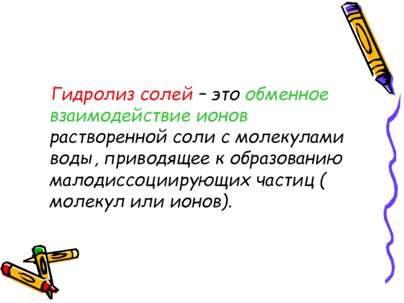 Гидролиз солей – это обменное взаимодействие ионов растворенной соли с молекулами воды, приводящее к образованию малодиссоциирующих частиц ( молекул или ионов).