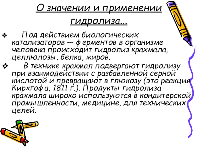 О значении и применении гидролиза...   Под действием биологических катализаторов — ферментов в организме человека происходит