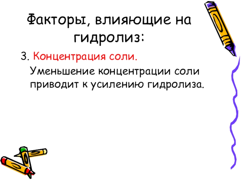 Факторы, влияющие на гидролиз:3. Концентрация соли.  Уменьшение концентрации соли приводит к усилению гидролиза.