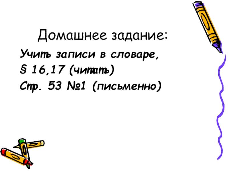 Домашнее задание:Учить записи в словаре,§ 16,17 (читать)Стр. 53 №1 (письменно)