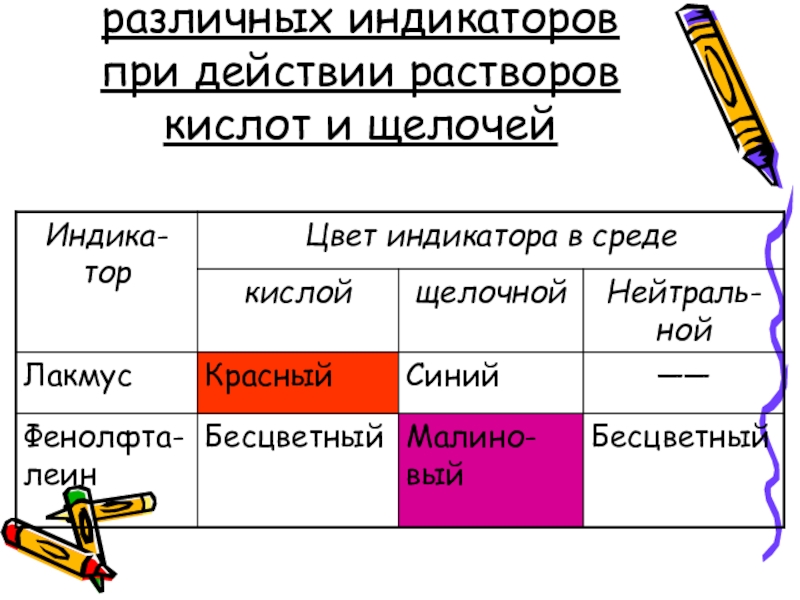 Изменение цвета различных индикаторов при действии растворов кислот и щелочей