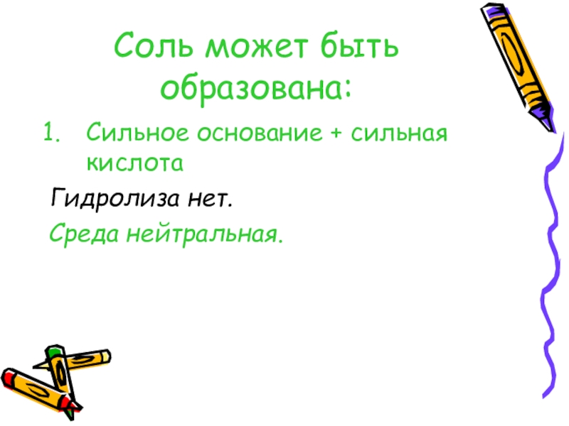 Соль может быть образована:Сильное основание + сильная кислотаГидролиза нет.Среда нейтральная.