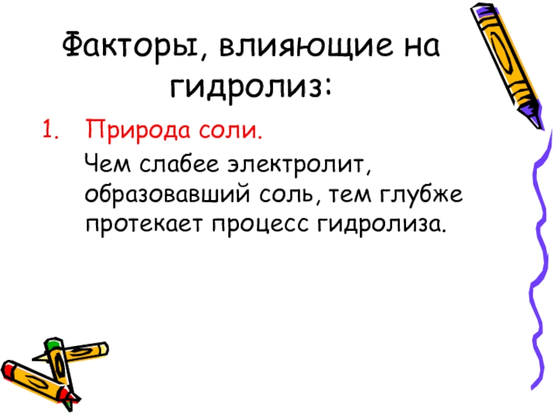Факторы, влияющие на гидролиз:Природа соли.   Чем слабее электролит, образовавший соль, тем глубже протекает процесс гидролиза.
