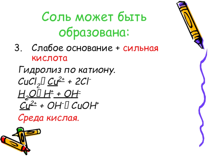 Соль может быть образована:Слабое основание + сильная кислотаГидролиз по катиону.CuCl2? Cu2+ + 2Cl-H2O? H+ + OH- Cu2+
