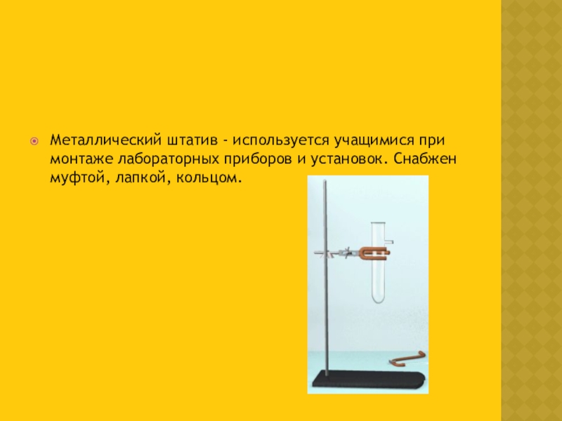 Металлический штатив - используется учащимися при монтаже лабораторных приборов и установок. Снабжен муфтой, лапкой, кольцом.