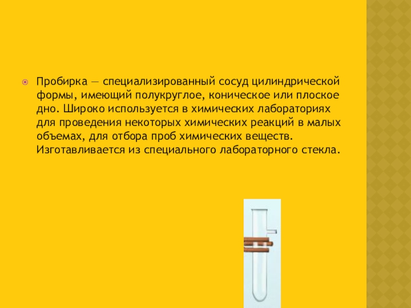 Пробирка — специализированный сосуд цилиндрической формы, имеющий полукруглое, коническое или плоское дно. Широко используется в химических лабораториях