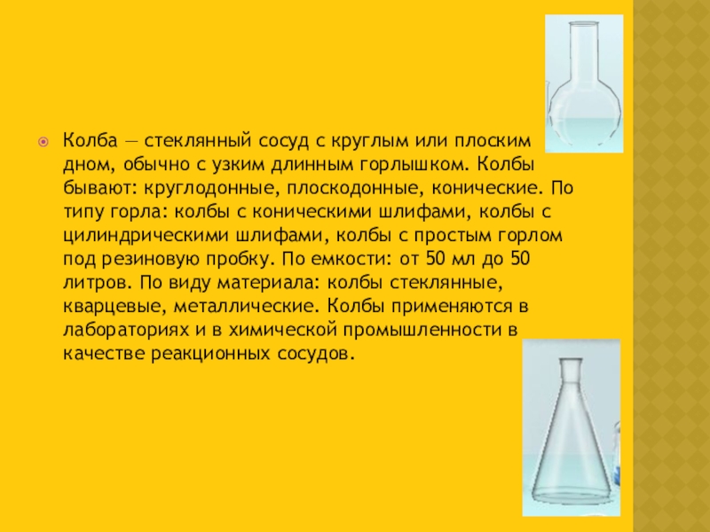 Колба — стеклянный сосуд с круглым или плоским дном, обычно с