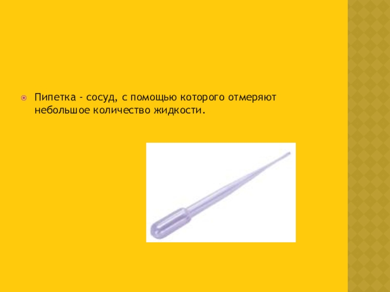 Пипетка - сосуд, с помощью которого отмеряют небольшое количество жидкости.