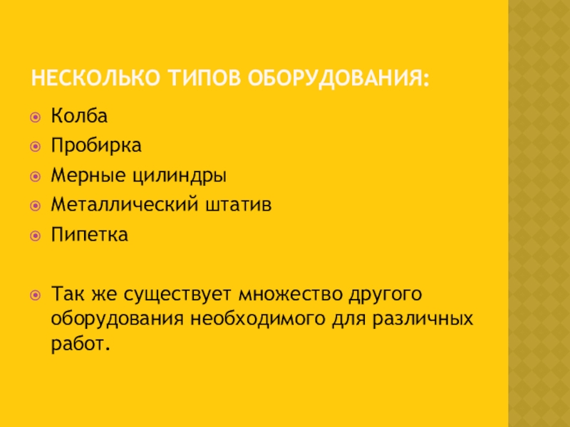НЕСКОЛЬКО ТИПОВ ОБОРУДОВАНИЯ:КолбаПробиркаМерные цилиндрыМеталлический штативПипеткаТак же существует множество другого оборудования необходимого для различных работ.