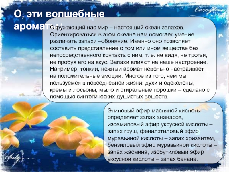 Этиловый эфир масляной кислоты определяет запах ананасов, изоамиловый эфир уксусной кислоты – запах груш, фенилэтиловый эфир муравьиной кислоты – запах хризантем, бензиловый эфир муравьиной кислоты – запах жасмина, изобутиловый эфир уксусной кислоты – запах банана.