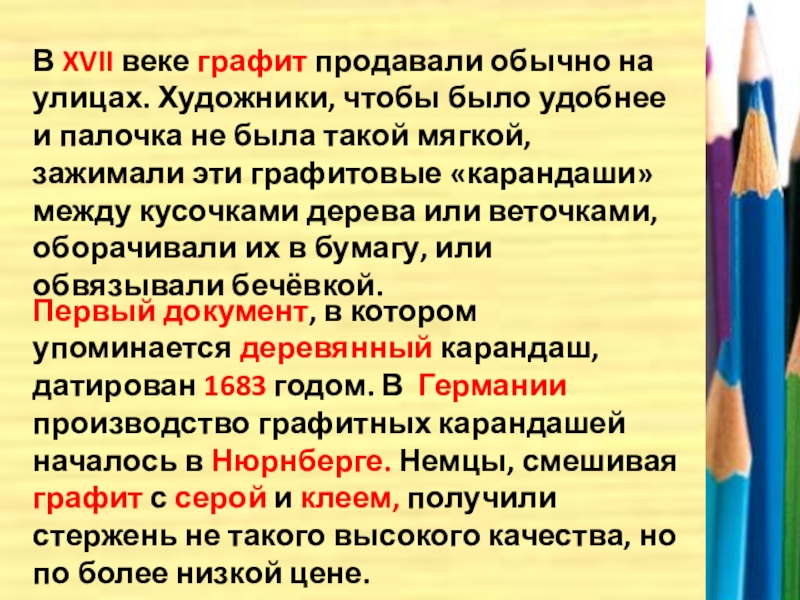 Первый документ, в котором упоминается деревянный карандаш, датирован 1683 годом. В Германии производство графитных карандашей началось в Нюрнберге. Немцы, смешивая графит с серой и клеем, получили стержень не такого высокого качества, но по более низкой цене.