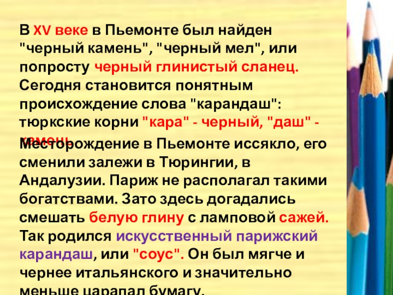 Месторождение в Пьемонте иссякло, его сменили залежи в Тюрингии, в Андалузии. Париж не располагал такими богатствами. Зато здесь догадались смешать белую глину с ламповой сажей. Так родился искусственный парижский карандаш, или "соус". Он был мягче и чернее итальянского и значительно меньше царапал бумагу.