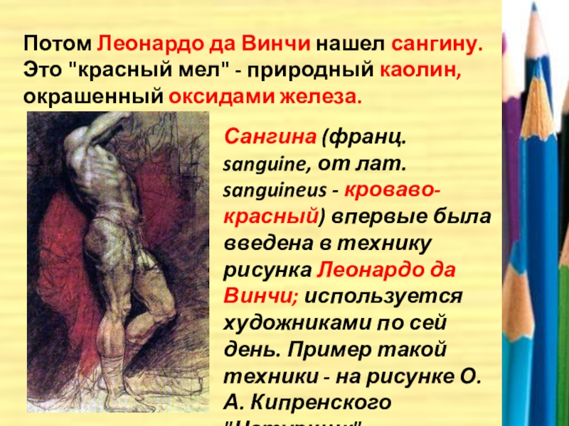 Слайд 8Потом Леонардо да Винчи нашел сангину. Это "красный мел" - природный