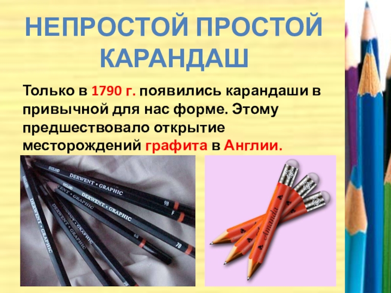 Слайд 28На первый взгляд карандаш кажется простым предметом, состоящим из пишущего стержня