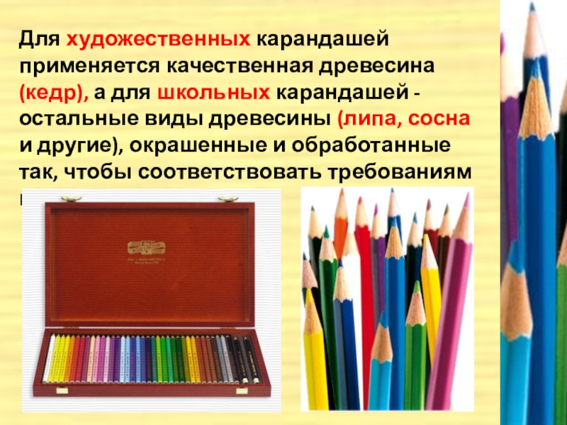 Слайд 26Для художественных карандашей применяется качественная древесина (кедр), а для школьных карандашей