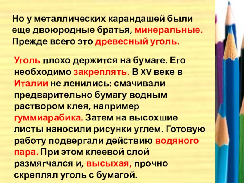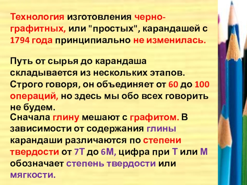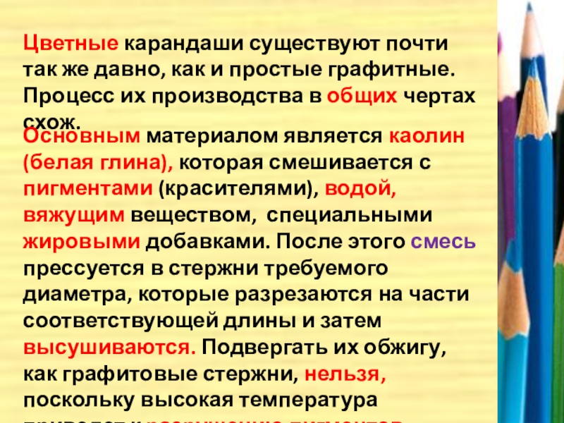 Слайд 23Цветному карандашу графит не нужен. Стержень его состоит из глины, какого-нибудь