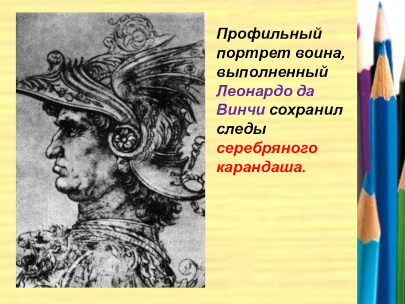 Слайд 6Профильный портрет воина, выполненный Леонардо да Винчи сохранил следы серебряного карандаша.