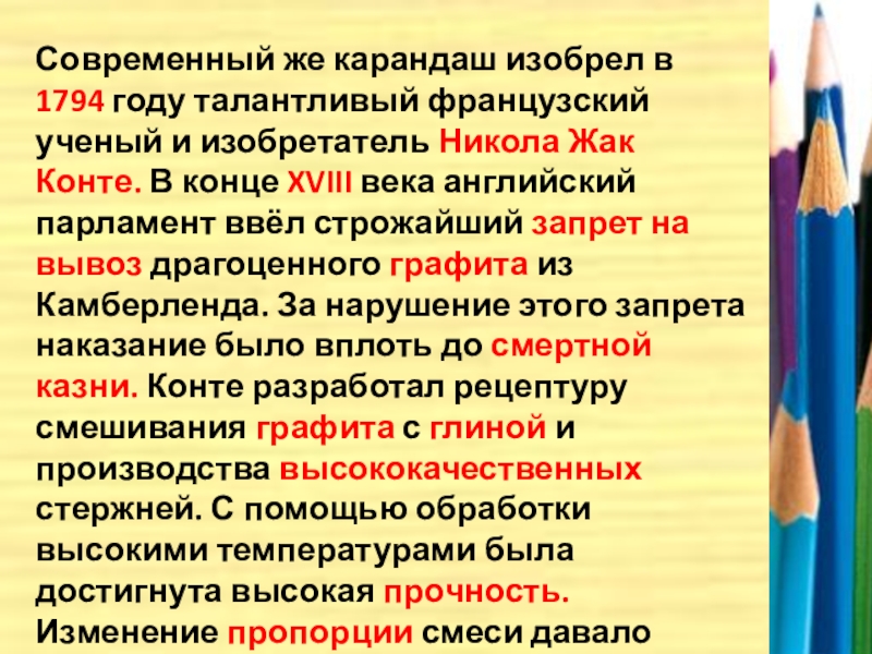 Слайд 14Современный же карандаш изобрел в 1794 году талантливый французский ученый и