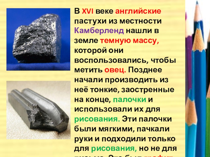 темную массу, которой они воспользовались, чтобы метить овец. Позднее начали производить из неё тонкие, заостренные на конце, палочки и использовали их для рисования. Эти палочки были мягкими, пачкали руки и подходили только для рисования, но не для письма. Это был графит.