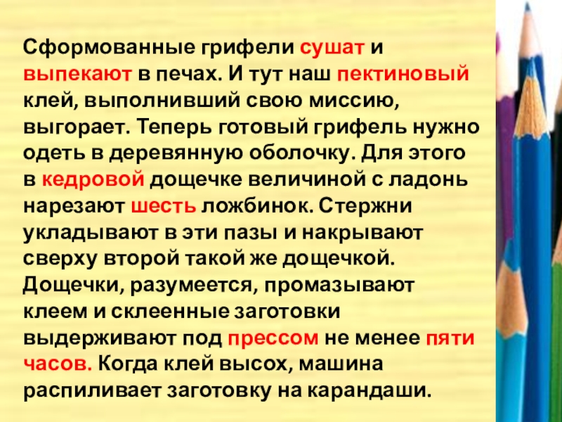 Слайд 18Сформованные грифели сушат и выпекают в печах. И тут наш пектиновый