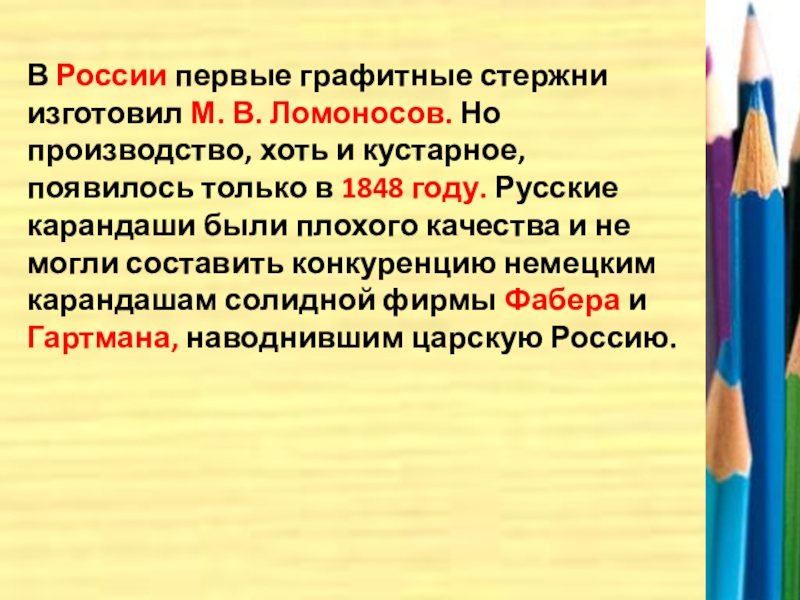хоть и кустарное, появилось только в 1848 году. Русские карандаши были плохого качества и не могли составить конкуренцию немецким карандашам солидной фирмы Фабера и Гартмана, наводнившим царскую Россию.
