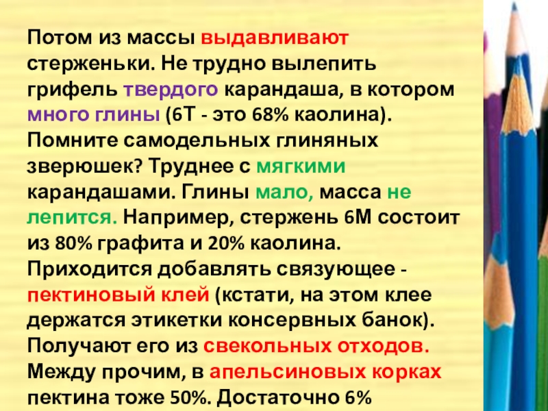 в котором много глины (6Т - это 68% каолина). Помните самодельных глиняных зверюшек? Труднее с мягкими карандашами. Глины мало, масса не лепится. Например, стержень 6М состоит из 80% графита и 20% каолина. Приходится добавлять связующее - пектиновый клей (кстати, на этом клее держатся этикетки консервных банок). Получают его из свекольных отходов. Между прочим, в апельсиновых корках пектина тоже 50%. Достаточно 6% пектинового клея, и масса для стержня 6М становится пластичной.