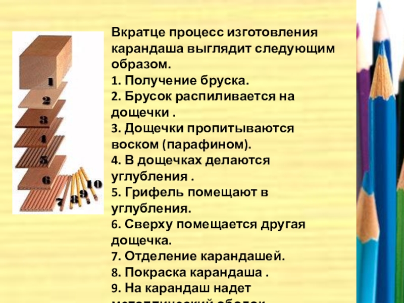 Слайд 20Вкратце процесс изготовления карандаша выглядит следующим образом.