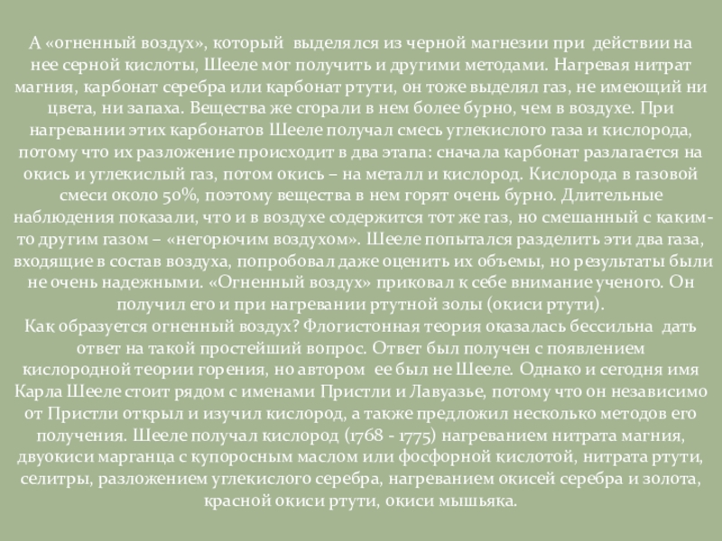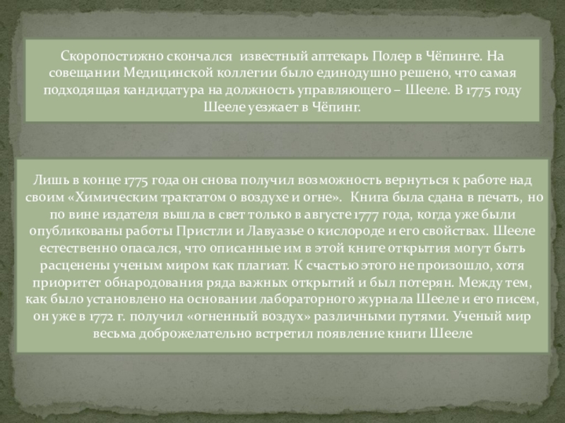 Лишь в конце 1775 года он снова получил возможность вернуться к работе над своим «Химическим трактатом о воздухе и огне». Книга была сдана в печать, но по вине издателя вышла в свет только в августе 1777 года, когда уже были опубликованы работы Пристли и Лавуазье о кислороде и его свойствах. Шееле естественно опасался, что описанные им в этой книге открытия могут быть расценены ученым миром как плагиат. К счастью этого не произошло, хотя приоритет обнародования ряда важных открытий и был потерян. Между тем, как было установлено на основании лабораторного журнала Шееле и его писем, он уже в 1772 г. получил «огненный воздух» различными путями. Ученый мир весьма доброжелательно встретил появление книги Шееле
