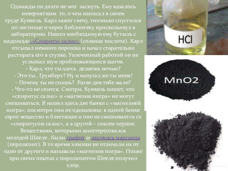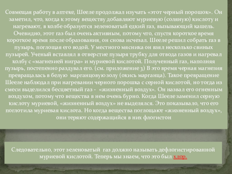Следовательно, этот зеленоватый газ должно называть дефлогистированной муриевой кислотой. Теперь мы знаем, что это был хлор.