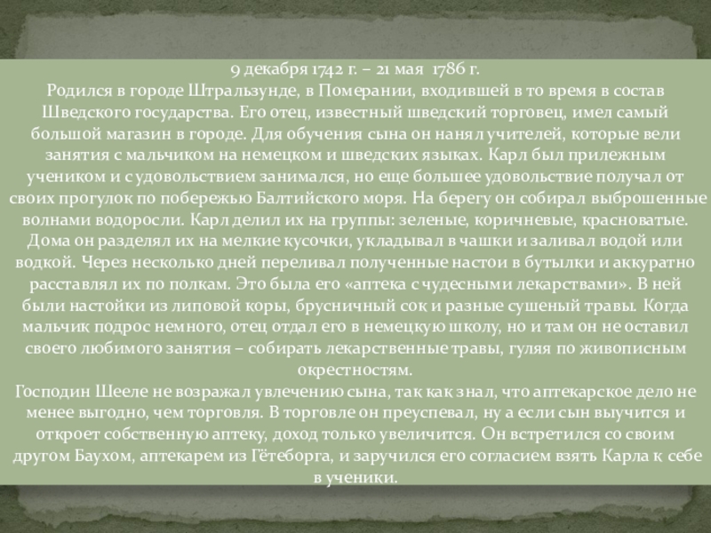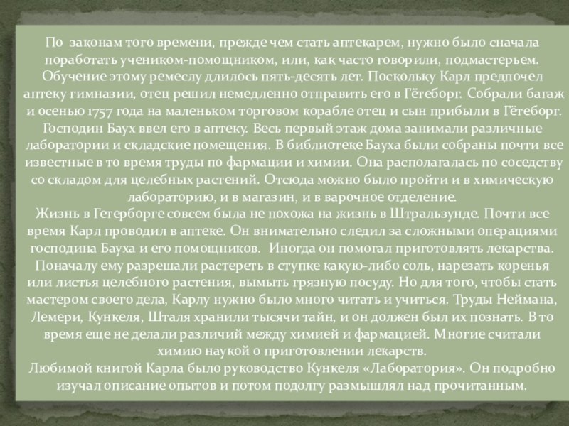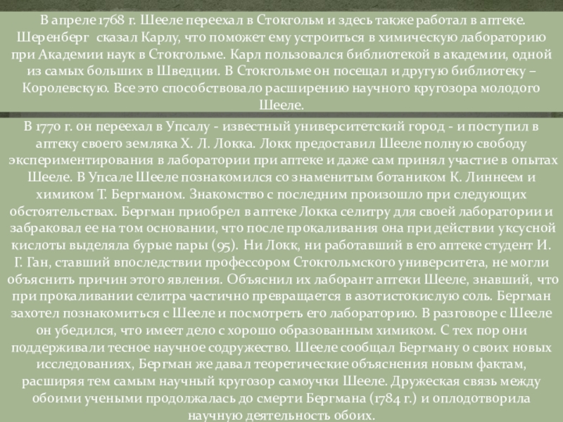 В 1770 г. он переехал в Упсалу - известный университетский город - и поступил в аптеку своего земляка X. Л. Локка. Локк предоставил Шееле полную свободу экспериментирования в лаборатории при аптеке и даже сам принял участие в опытах Шееле. В Упсале Шееле познакомился со знаменитым ботаником К. Линнеем и химиком Т. Бергманом. Знакомство с последним произошло при следующих обстоятельствах. Бергман приобрел в аптеке Локка селитру для своей лаборатории и забраковал ее на том основании, что после прокаливания она при действии уксусной кислоты выделяла бурые пары (95). Ни Локк, ни работавший в его аптеке студент И. Г. Ган, ставший впоследствии профессором Стокгольмского университета, не могли объяснить причин этого явления. Объяснил их лаборант аптеки Шееле, знавший, что при прокаливании селитра частично превращается в азотистокислую соль. Бергман захотел познакомиться с Шееле и посмотреть его лабораторию. В разговоре с Шееле он убедился, что имеет дело с хорошо образованным химиком. С тех пор они поддерживали тесное научное содружество. Шееле сообщал Бергману о своих новых исследованиях, Бергман же давал теоретические объяснения новым фактам, расширяя тем самым научный кругозор самоучки Шееле. Дружеская связь между обоими учеными продолжалась до смерти Бергмана (1784 г.) и оплодотворила научную деятельность обоих.