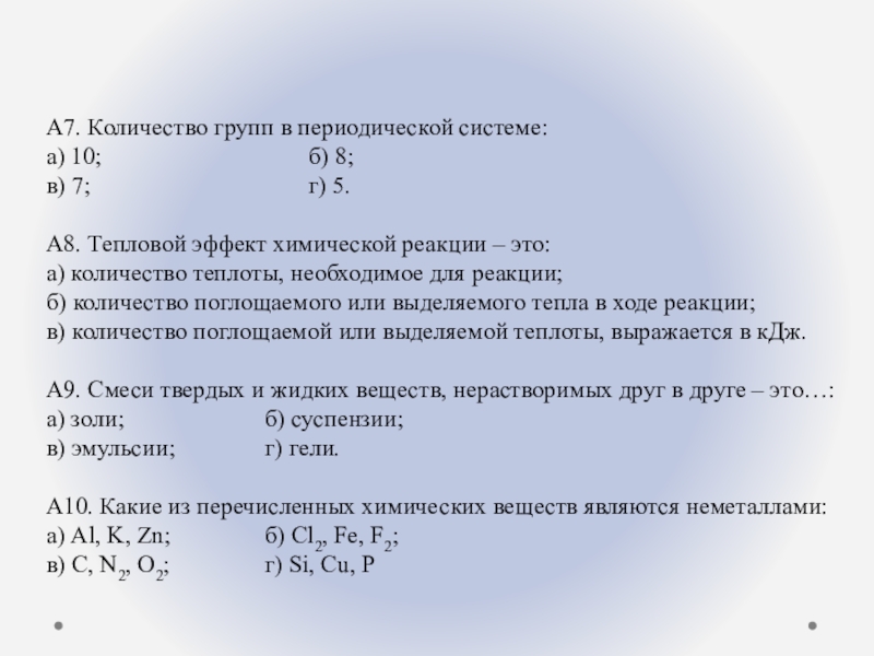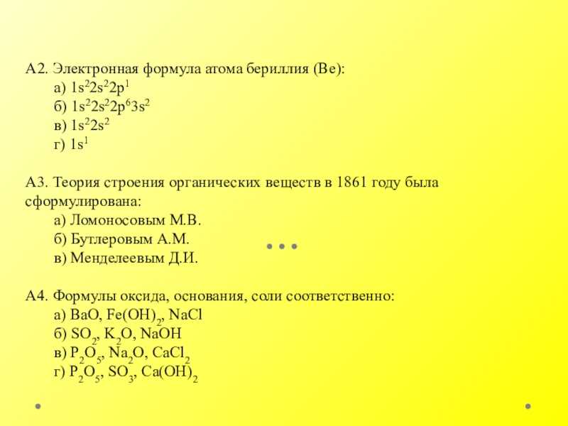 №1 (А) студент должен вспомнить важнейшие химические даты, показать уровень знаний причин и следствий событий, имена великих ученых - химиков, результаты их деятельности; основные понятия и закономерности химических теорий, законов; сущности химических процессов; химическую терминологию, формулы и названия химических веществ.