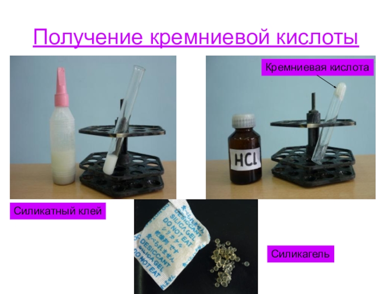 Получение: K2SiO3 + 2HCl = 2KCl + H2SiO3↓