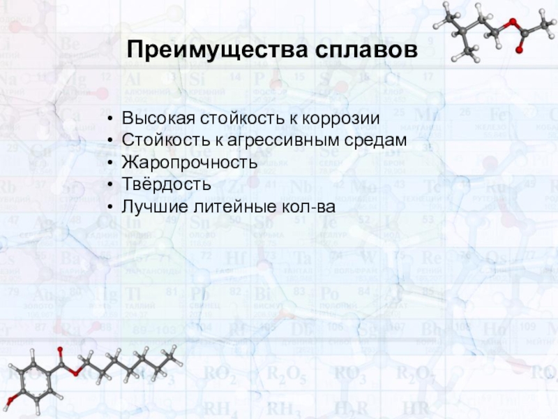 Преимущества сплавовВысокая стойкость к коррозии Стойкость к агрессивным средамЖаропрочностьТвёрдостьЛучшие литейные кол-ва